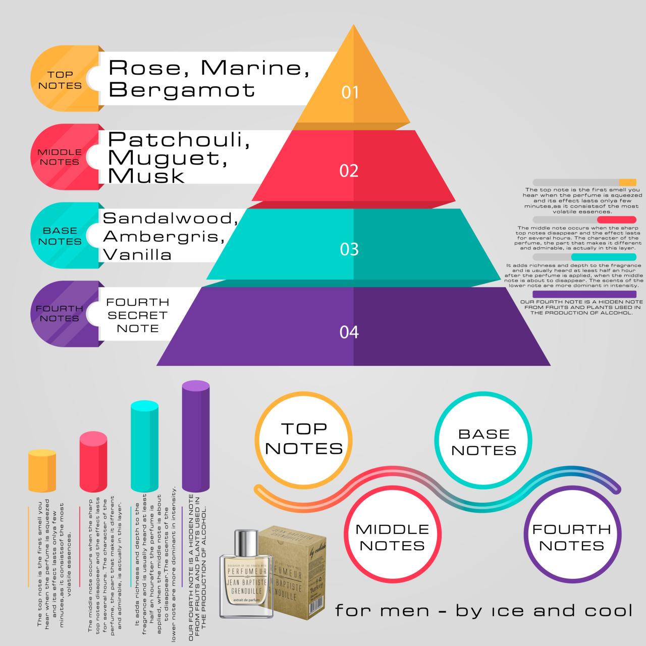✔ Ice and Cool Perfume; Top Note: Rose, Marine, Bergamot. Middle Note: Patchouli, Muguet, Musk. Base Note: Sandalwood, Ambergris, Vanilla, Musk. Amber and musk create a soothing, refreshing and inviting scent.