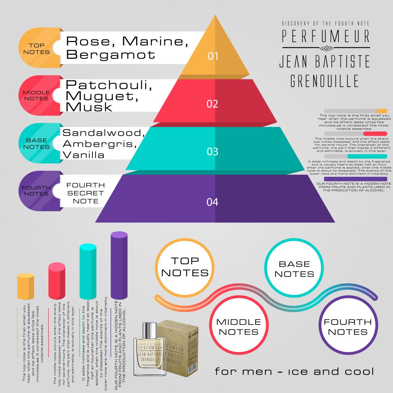 ✔ Ice and Cool Perfume; Top Note: Rose, Marine, Bergamot. Middle Notes: Patchouli, Muguet, Musk. Last Note: Sandalwood, Ambergris, Vanilla, Musk. Amber and musk create a soothing, refreshing and inviting scent.