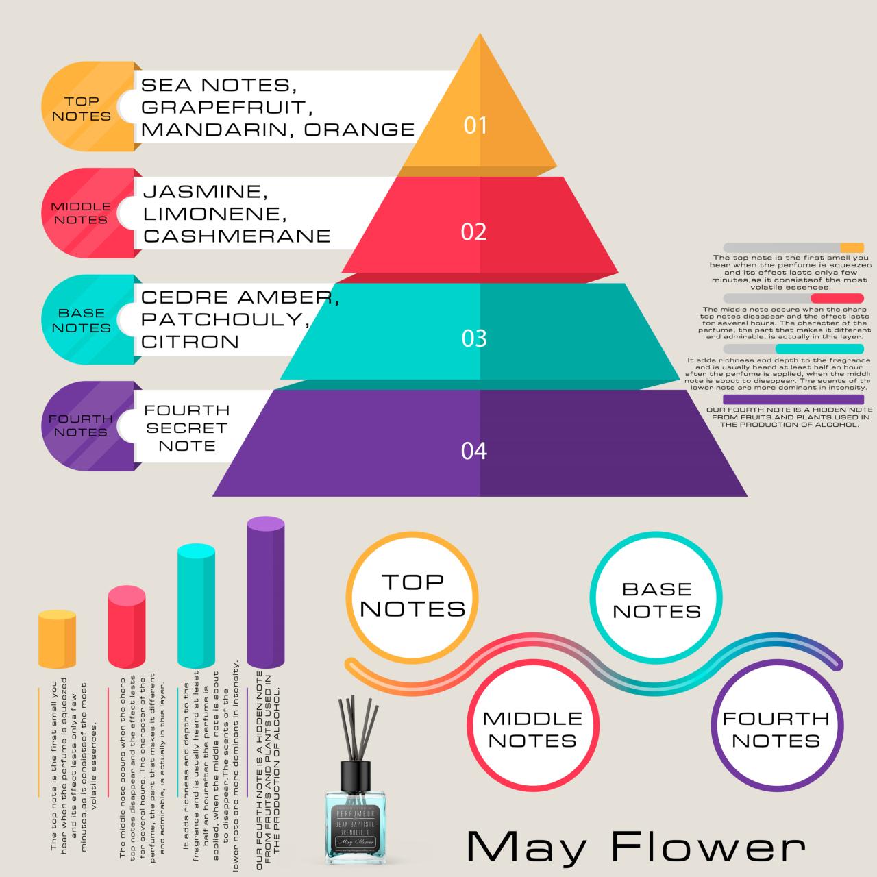 ✔ Sea Notes, Mandarin, Grapefruit and Orange on Top; middle notes are Jasmine and Limonene and Cashmeran; A real fruit feast with base notes of Patchouli, Cedar Amber and Citron. Extremely refreshing, fresh and clear, this unisex perfume will hold strong emotions in your mind. Just like the smells you can remember from your holidays at sea.