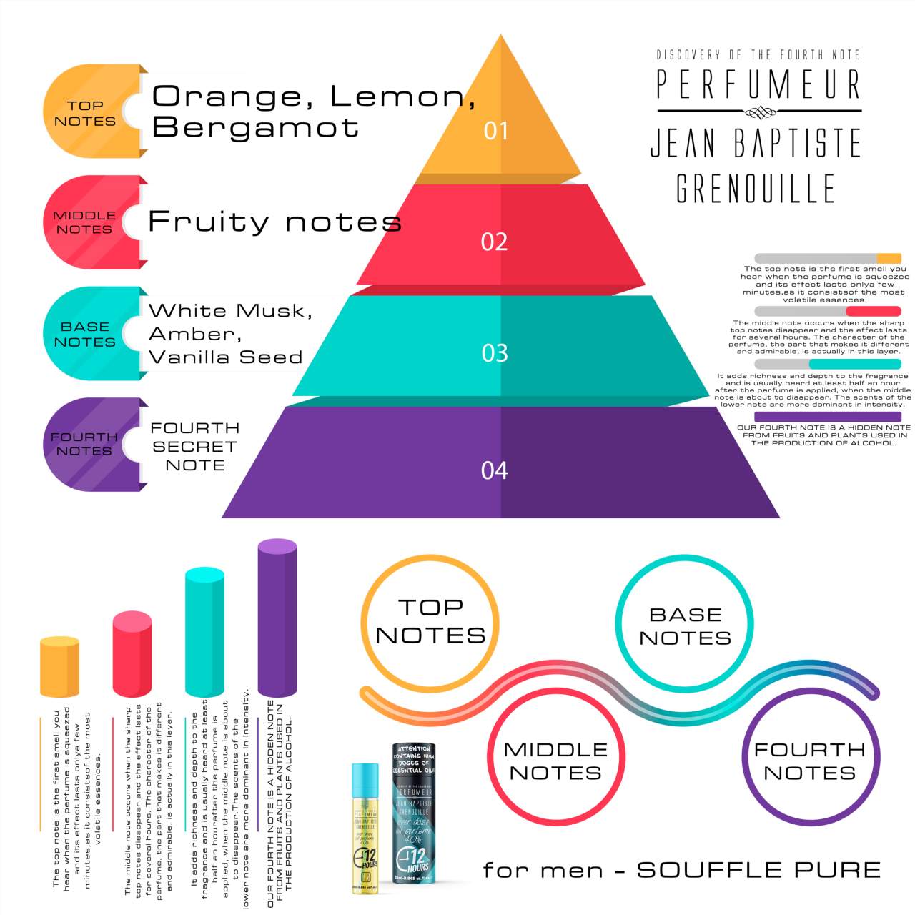 ✔ Ball Note; Orange and Lemon, Bergamot. Middle Note; Fruity notes. Final Note; White Musk, Amber and Vanilla Seed.