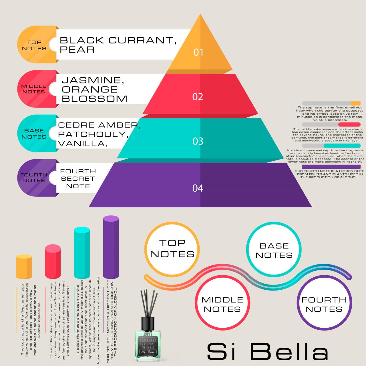 ✔ Si Bella, where the sherbet-like sweet and tart scents of black currant leaves that come directly to your nose are balanced with juicy pears, will ignite a spark of joy in you. The caramelization of freshly baked fruits in their own juices on a cool autumn morning will dance with your imagination. Si Bella will give you the atmosphere of a sexy night full of bright stars with its delightful notes of jasmine and protacal flower, deep vanilla, patchouli and cedar amber.