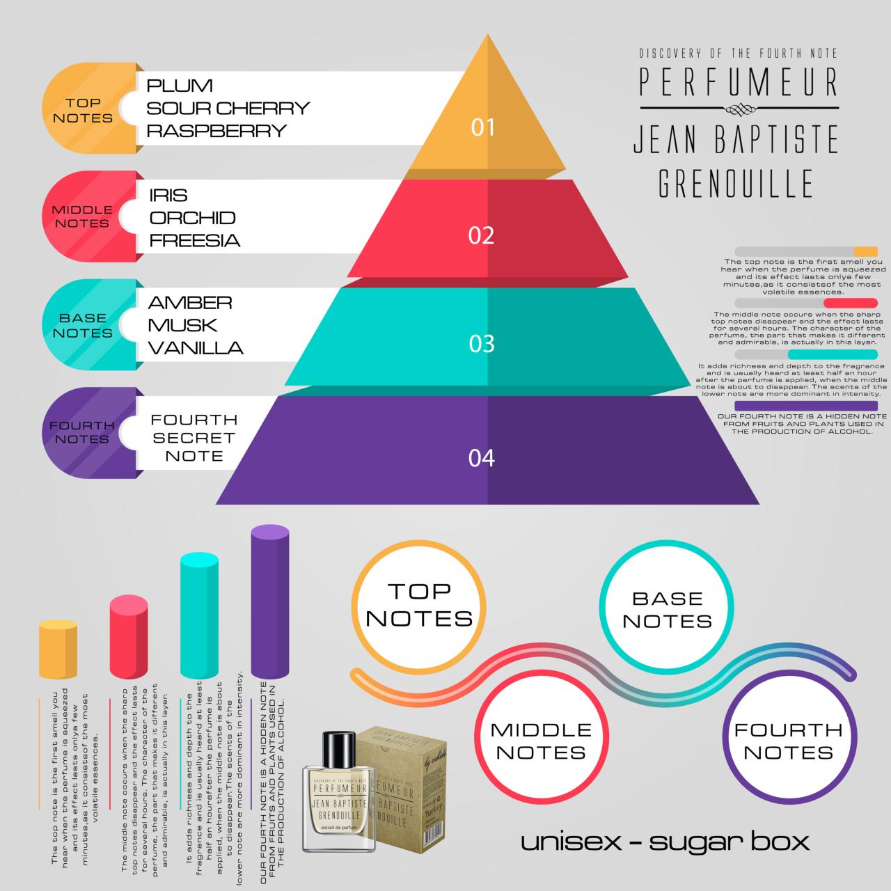 ✔ Sugar Box Perfume; Top Note: Plum Sour Cherry, Raspberry. Middle Note: Iris, Orchid, Freesia. Base Note: Amber, Musk, Vanilla. Musk Amber and musk create a soothing, refreshing and inviting scent.